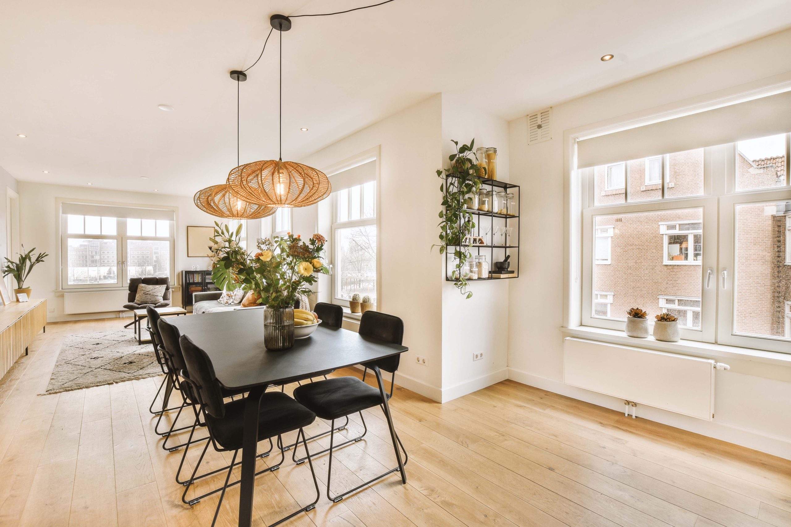 a dining room with wood flooring and white walls there is a black table, four chairs and a planter in the center